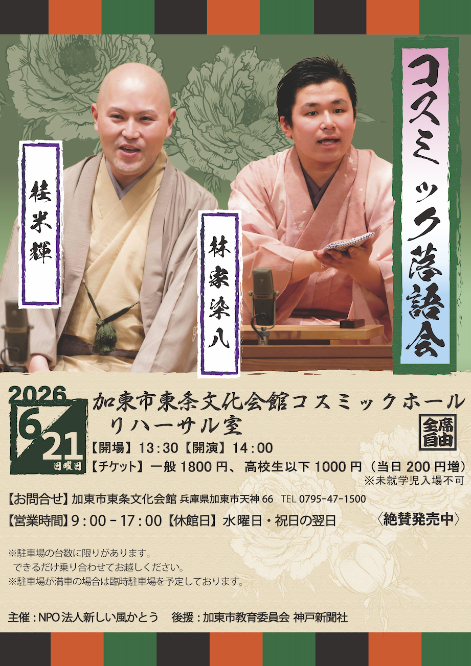 EDUCATION & COMMUNITY EVENTS 2026/6/21 コスミック落語会 2026年4月6日2026年4月6日 webmaster 11 Views desuga, featured 日時 2026年6月21日(日) 13:30開場 14:00開演 会場 加東市東条文化会館 リハーサル室 入場料 一般 1,800円 高校生以下 1,000円 (当日200円増) 全席自由 出演 林家染八 桂米輝 主催 特定非営利活動法人 新しい風かとう 後援 加東市教育委員会 株式会社 神戸新聞社 お問い合わせ 加東市東条文化会館 兵庫県加東市天神66番地 TEL 0795-47-1500